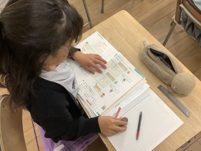 算数の授業で、重さを勉強しています。自分たちで重さを予想し、袋に土を入れて、重さをはかりました。1㎏や500gなどの重さを実際に体感することで、重さの予測がたてやすくなりました。