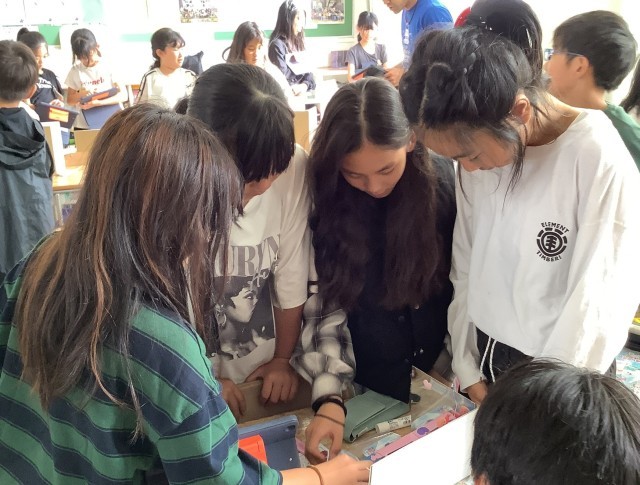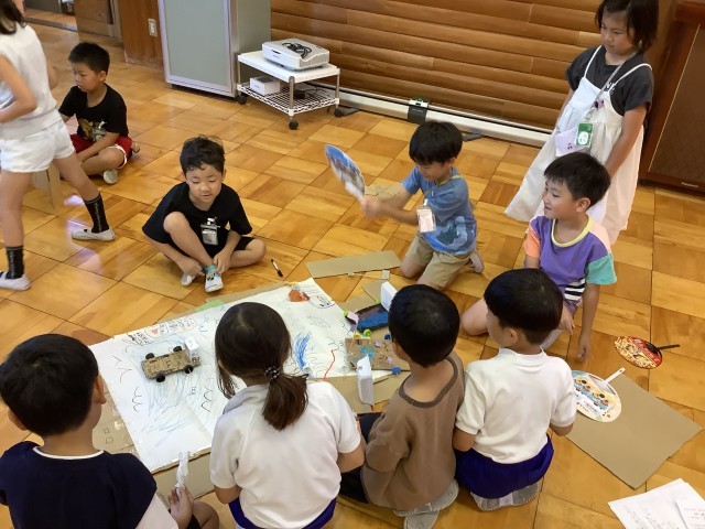 友達の作品をみて、「すごいね」「どこ工夫したの?」と質問しながら鑑賞をしていました。