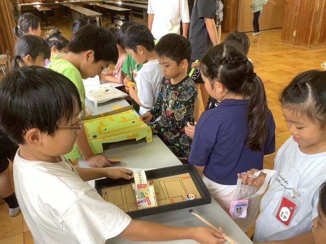 2年生が工夫した楽しいゲームに、1年生も夢中になって遊んでいました。