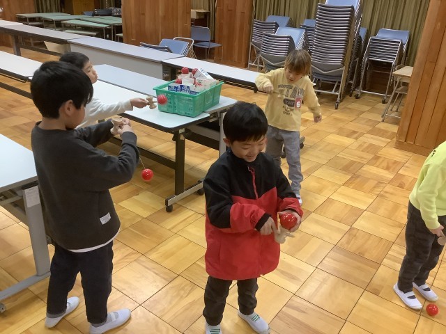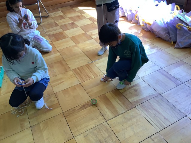 1年生は生活科の授業で昔遊びを楽しみました。こまやけん玉、お手玉など、昔から伝わる遊びに挑戦し、友達と教え合いながら笑顔で活動する姿が見られました。