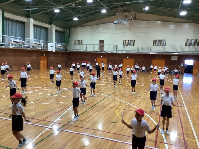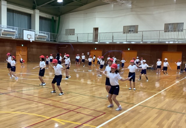 体育の授業でリズム縄跳びをしました。