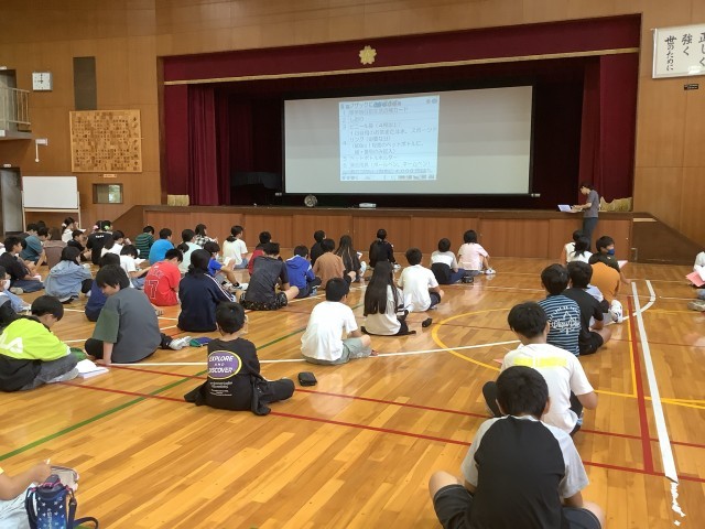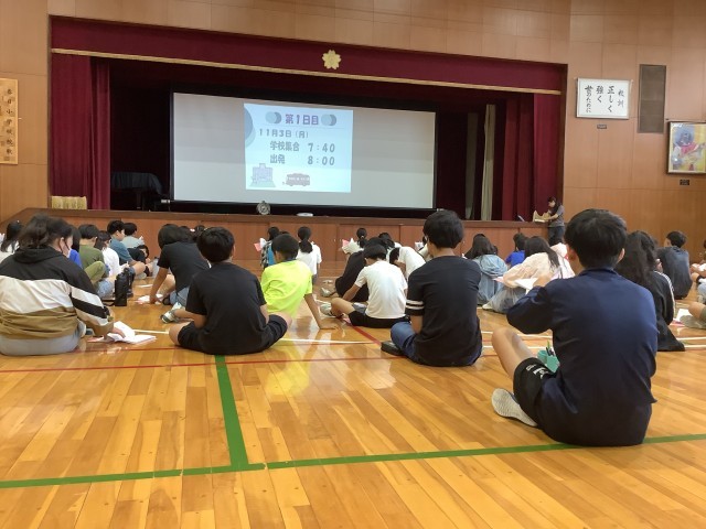 体育館に集まり、修学旅行の説明会を行いました。しおりとスライドを見ながら日程や持ち物などを確認する中で、修学旅行に向けて期待を高めることができました。思い出に残る修学旅行になるよう、少しずつ準備を進めていきます。