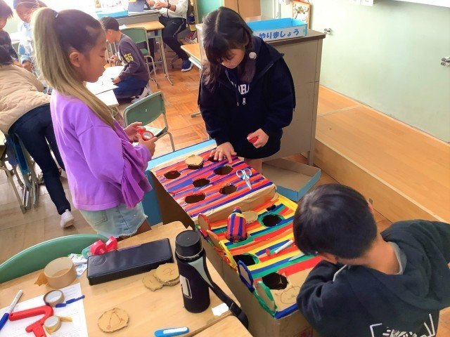 生活科の学習では、学習発表会に向けて「おもちゃづくり」をグループで協力して作成しています。子どもたちは、楽しみながら一生懸命作っていますので、当日楽しみにお待ちいただきたいです。