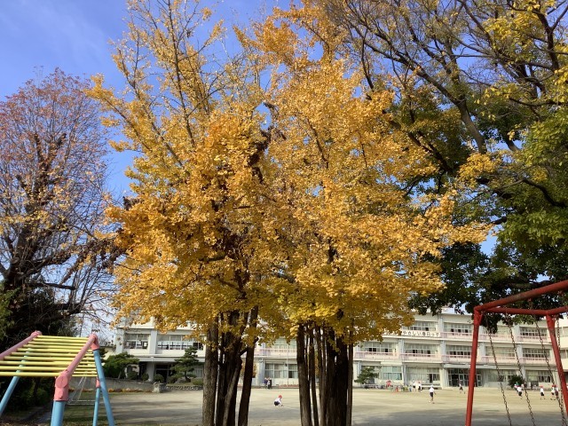秋晴れの空に、いちょうの木が鮮やかに映えています。
