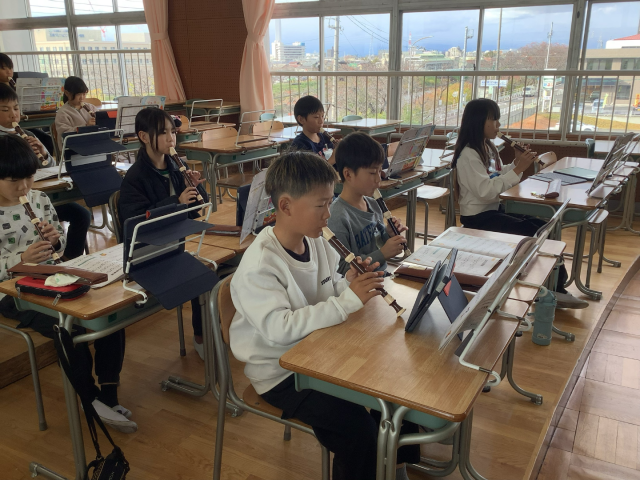 音楽では、リコーダーの指の使い方の確認を行っています。