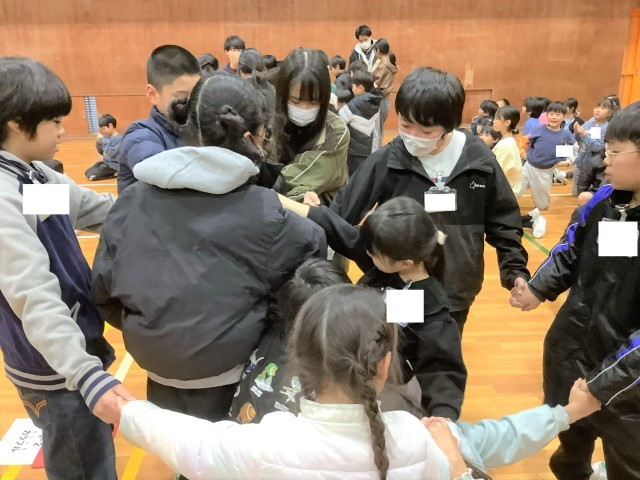 全校集会を行いました。人間知恵の輪ゲームでは、縦割り班ごとに協力し、楽しく知恵の輪をほどくことができました。