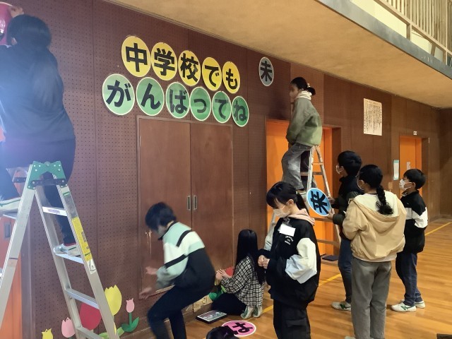お別れ集会、卒業式に向けて体育館の飾り付けをしました。