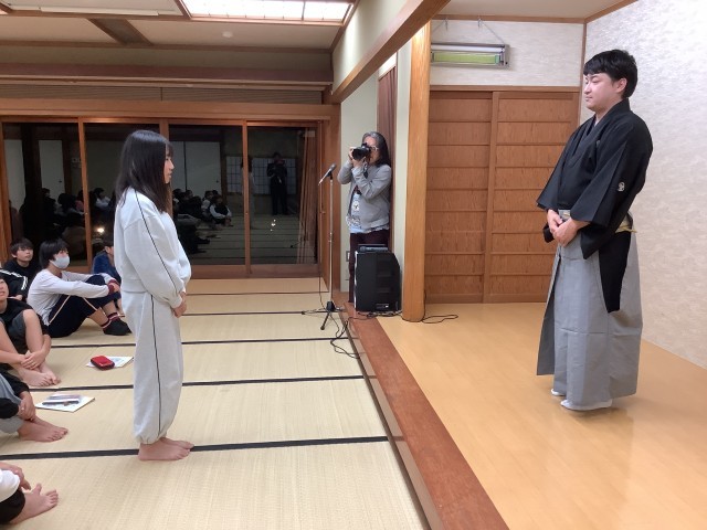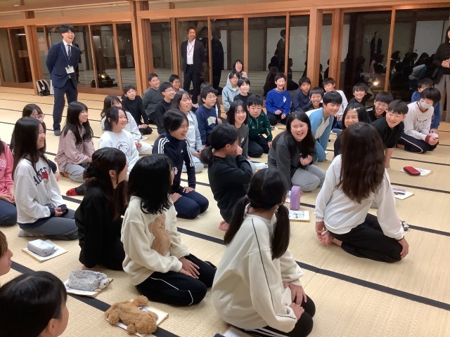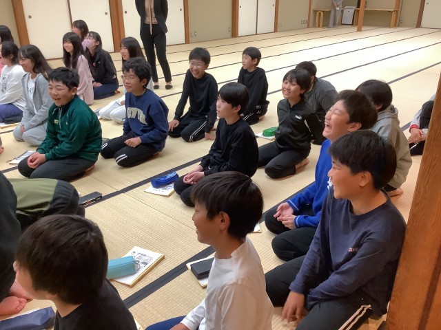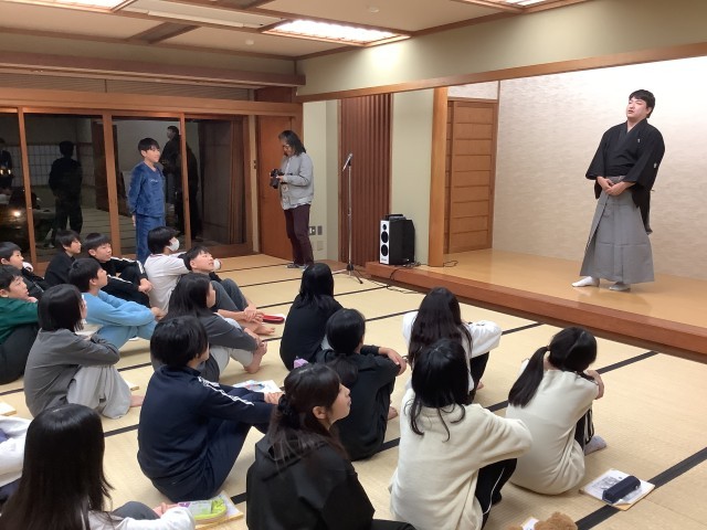 修学旅行 狂言体験 公開日 2025/11/03 更新日 2025/11/03 6年生 プロの狂言師の方にお越しいただき、「柿山伏」を披露していただきました。また、「大笑い」の技術も体験でき、笑いが絶えない楽しいひとときを過ごしました。この後、各部屋で一日の振り返りを行い、就寝準備をします。今日のホームページの更新は以上です。明日もよろしくお願いします。 +3 いいね(1)