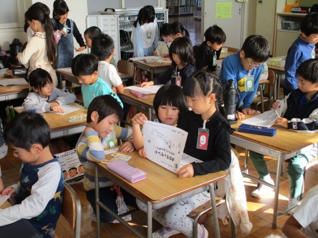 2年生は、生活科「うごく うごく わたしのおもちゃ」の学習で、14日におもちゃまつりを行います。今日は、1年生に招待状とパンフレットを渡しました。どんなおもちゃがあるのか、どんな遊びができるのかをパンフレットを見ながらお話ししました。1年生に楽しんでもらうために、はりきって準備を進めています。