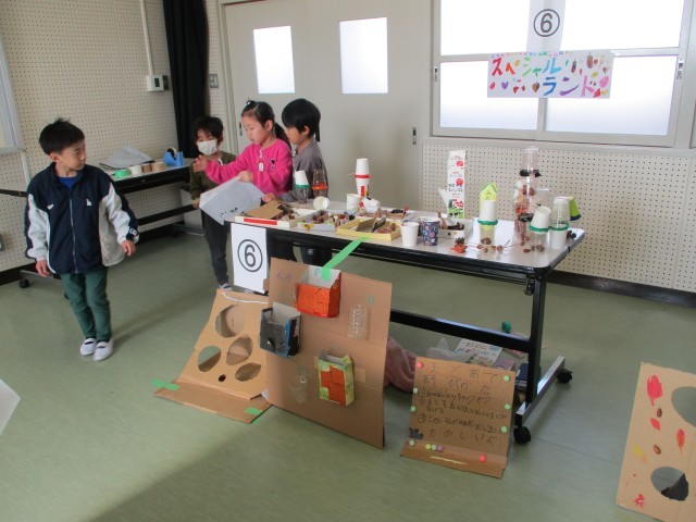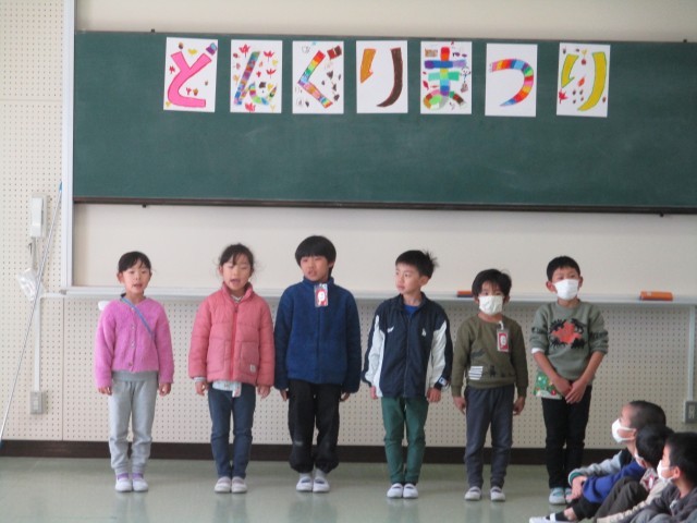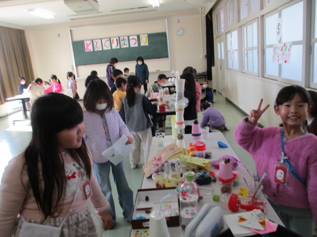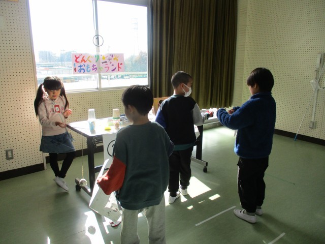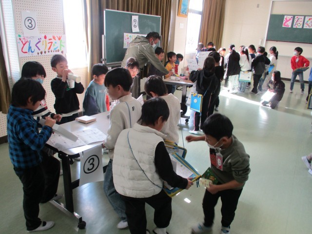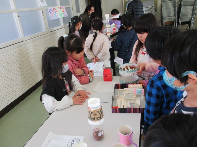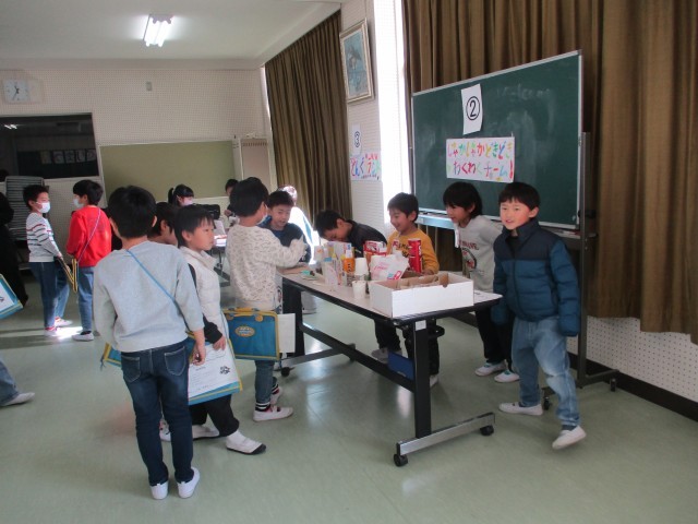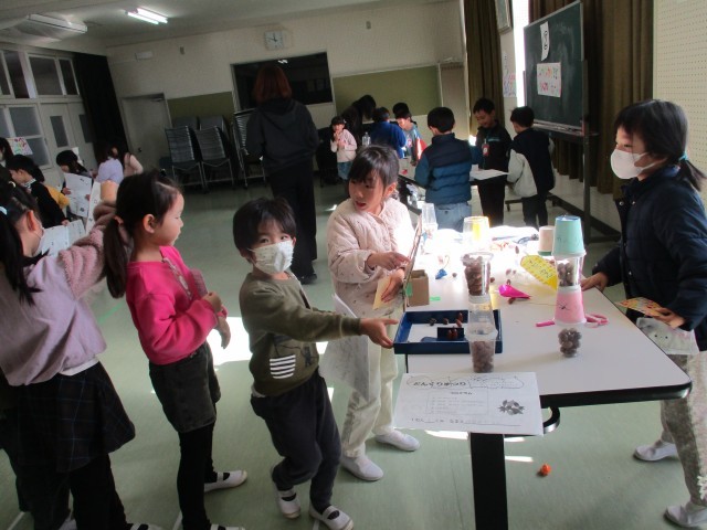 生活科「たのしいあきいっぱい」でつくったあきのおもちゃで、どんぐりまつりをしました。友達がつくったおもちゃで遊んだり、お店番をして自分のつくったおもちゃで遊んでもらったりしました。休み時間には2年生にも遊びに来てもらい、楽しい時間を過ごしました。
