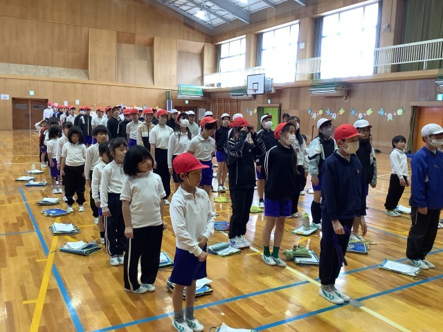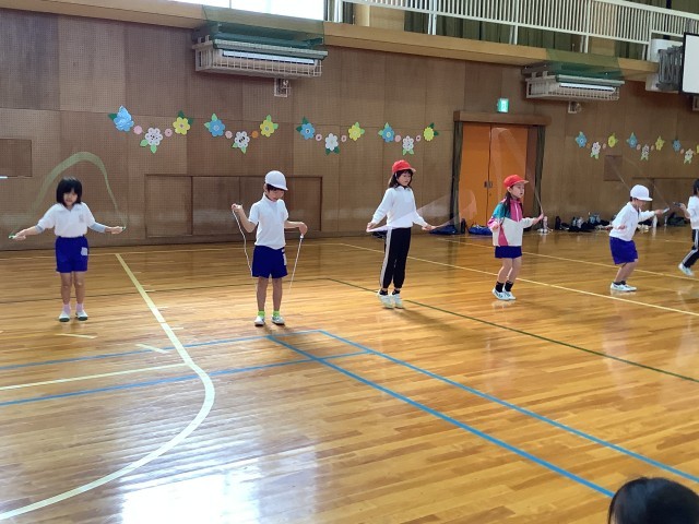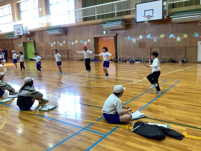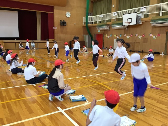 短なわ記録会がありました。前とび、後ろとび、片足とび、かけ足とびの4種目の中から2種目に挑戦し、6年生に計測してもらいました。なわとびの練習を始めてからとべる回数が増えました。みんながんばっています。