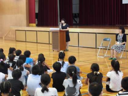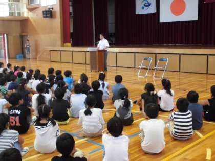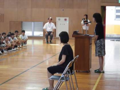 いよいよ2学期が始まりました。日焼けした元気な子どもたちが学校に戻ってきました。校長先生からは、夏休みに多くの行事に参加できたことや部活動で頑張っていた子どもたちについての話がありました。また、産休でお休みになる1年2組の古田先生のお別れの挨拶と、新しく見えた加古先生の赴任の挨拶がありました。