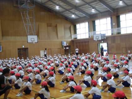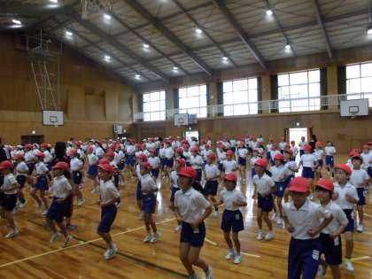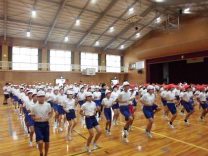 あいにくの雨模様で、運動会の全体練習が体育館で行われました。初めての全体での練習ということもあり、全員が真剣に取り組んでいました。5・6年生が手本になり、姿勢や行進の仕方などを確認しました。