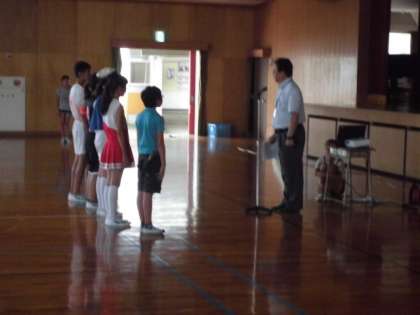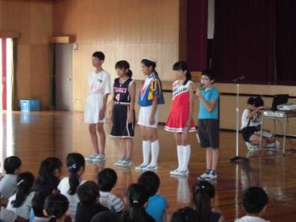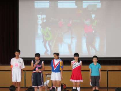 部活動激励会が行われました。サッカー部とバスケットボール部は来月に迫った西ブロック競技会に向けての意気込みを、ブラスバンド部とバトン部は、運動会とやると祭、市民体育祭に向けての練習の様子を、園芸部は今育てている作物についての発表がありました。最後に校長先生からお話がありました。将棋の藤井総太四段や卓球の張本智和選手の活躍に見られるように、小学生や中学生の時期には驚くほど成長する。これからもさらに練習や活動に励み、大きく成長することを期待していると話がありました。