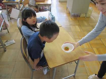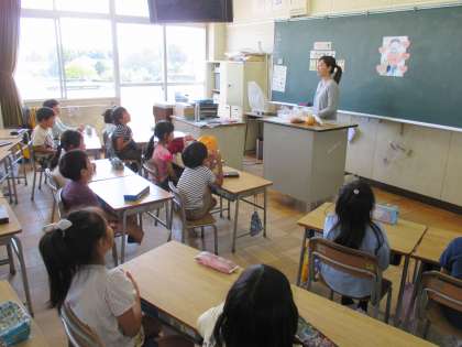 2年2組で食育指導がありました。栄養士の佐藤先生のお話を真剣に聞いていました。周りの生き物から命をいただいて生きていることを実感できました。