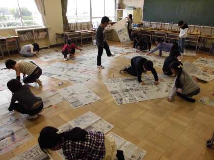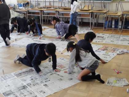 4年生は、面積の学習を進めています。今日は、実際の1平方メートルの広さを新聞紙で作ってみました。後で調べてみたら、1平方メートルの上に18人も乗れました。実際の広さは、子どもたちのイメージよりも広かったようです。1平方メートルの広さを実感できました。