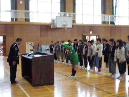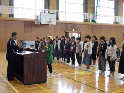 今朝、西枇杷島警察署の警察官の方がお見えになり、交通少年団認定式を行いました。班長・副班長が交通少年団として認定されました。6年生の代表児童が、交通ルールを守ること、下級生を安全に登下校させるという誓いの言葉を述べました。