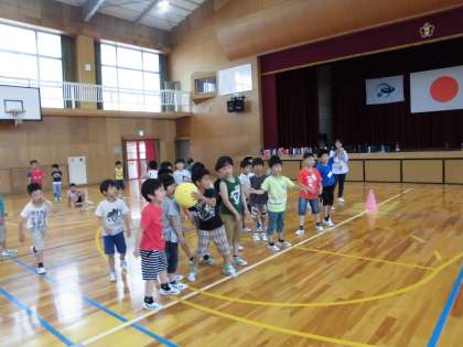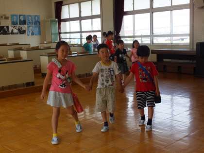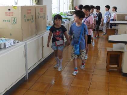 2年生が、1年生に学校の案内をしました。昨年育てたアサガオの種をプレゼントした後、普段あまり使うことがない特別教室に入って説明したり、歩き方のルールについて教えたりする姿が見られました。最後は体育館に集合して、ドッヂボールで遊びました。仲良く交流することができました。