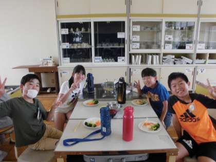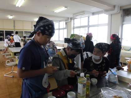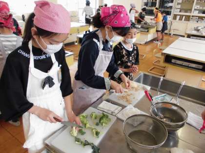 5年生は調理実習で「ゆでる」という調理方法について勉強しました。野外学習で覚えた野菜の切り方を、上手に活用していました。酢と油を混ぜて作ったドレッシングで、ゆであがった野菜をおいしく食べました。