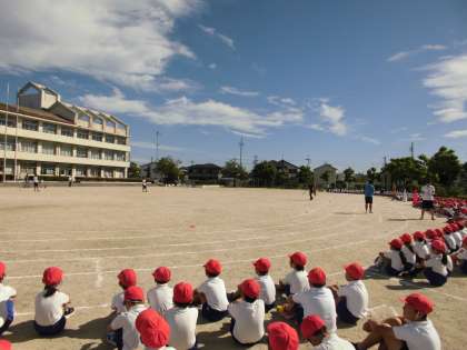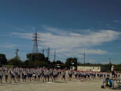 運動会に向けての練習が始まりました。今日は、開会式や閉会式の流れや入退場の方法を覚えました。さわやかな秋空の下、元気よく行進することができました。