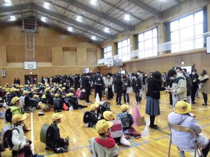 有事の際には、迎えに来ていただくことになります。今回の訓練では、保護者の方のご協力もあり、スムーズに行うことができました。引き渡し訓練にご参加いただき、ありがとうございました。