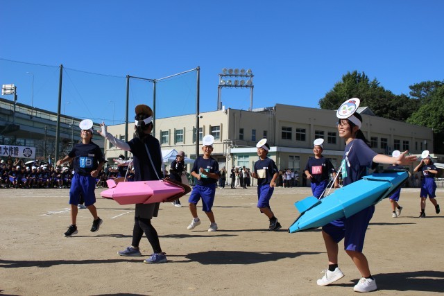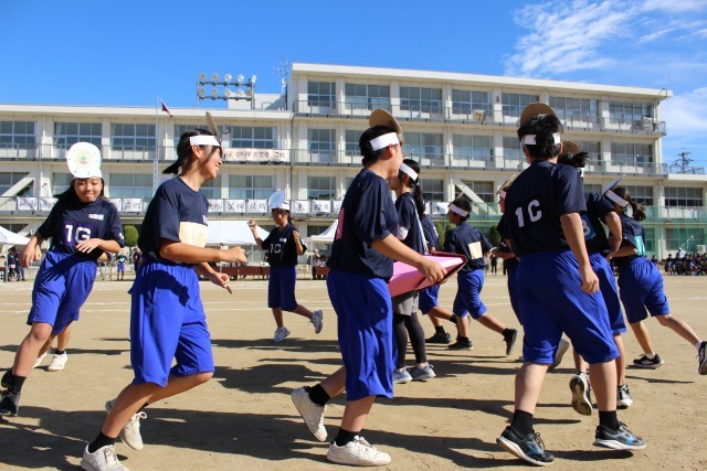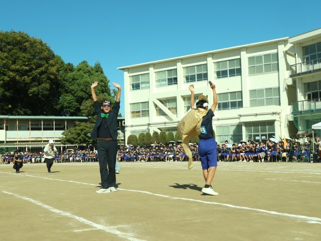 当初、天候が心配されましたが、当日は秋晴れのもと、体育祭を行うことができました。オープニングセレモニーでは、生徒会が中心となって全校を盛り上げてくれました。校長先生も生徒たちとともに踊って大いに盛り上がり、体育祭が始まりました。