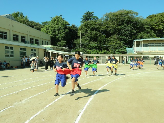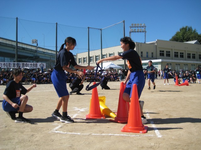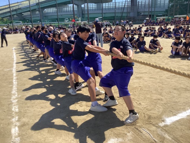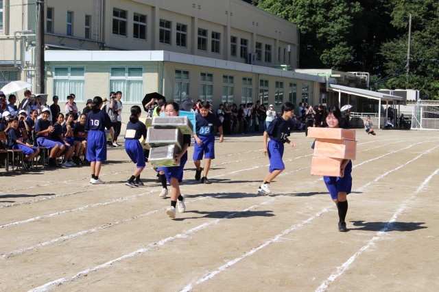体育祭では、午前中に8種類の競技を行いました。①スウェーデンリレー ②デカパンリレー ③宅配便リレー ④コーン集めゲーム ⑤綱引き ⑥ボール運びリレー ⑦代表リレー女子 ⑧代表リレー男子 の順に行いました。どのクラスも自分たちのクラスの旗を振り、大きな声で精一杯応援していました。