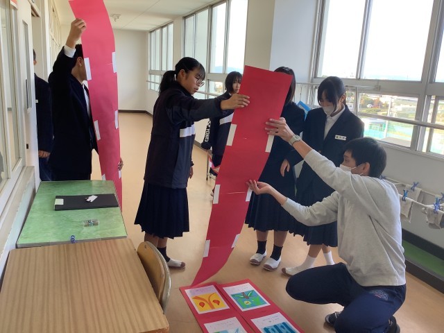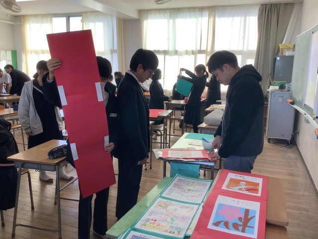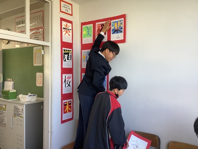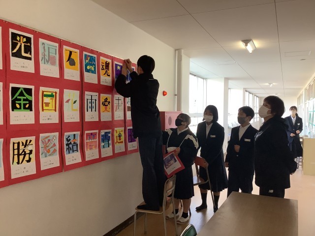 本日、期末テスト後の6時間目に校外学習新聞と美術の作品の展示作業を行いました。生徒が中心となって、楽しそうに作業を進めていました。作品は生徒が時間をかけて作り上げた力作ぞろいです。保護者の方には、保護者会の時にご覧いただけます。楽しみにしていて下さい。