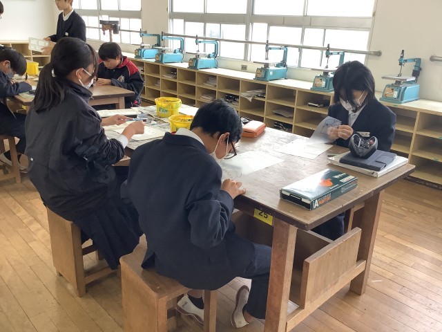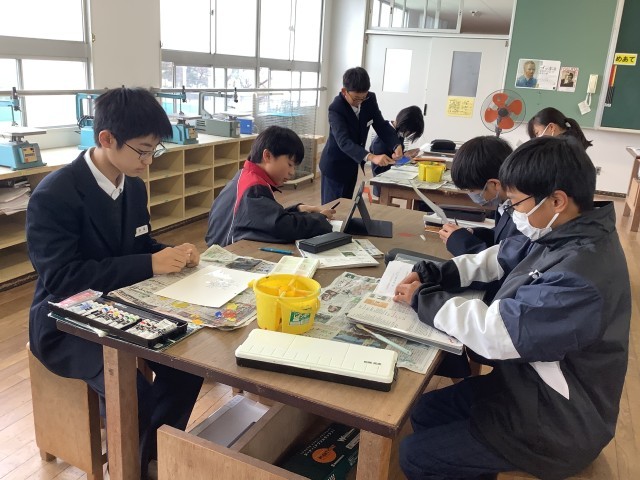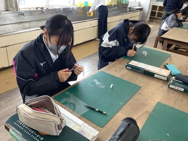 現在、一年生の美術の授業では、オリジナルの型を使ったスパッタリングの作品を製作しています。冬をテーマにしており、雪だるまやサンタクロースのようなかわいいデザインが多いです。どんな作品が出来上がるか、楽しみですね!
