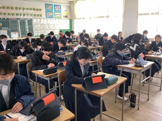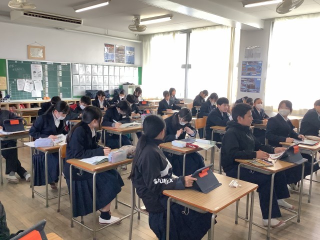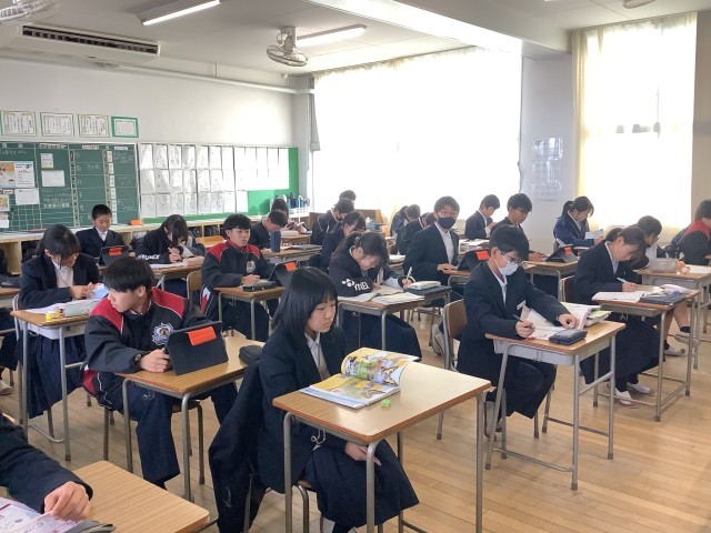 本日 1限目から5限目まで実力テストがありました。生徒たちは一生懸命問題を解いておりました。6限目には総合で自習の時間でしたが、生徒たちは学年末試験に向けて少しでも課題を進めておりました。学年末試験が楽しみです!