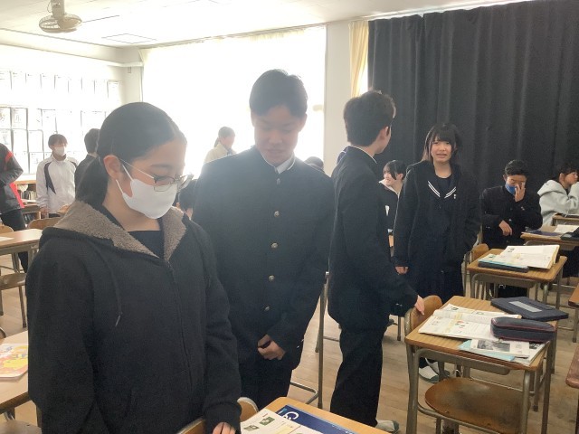 先日の英語の授業では、ペアになって英会話に取り組みました。冬休みに体験した出来事を相手に伝えようと、一人一人が工夫しながら頑張る姿が見られました。 学習や生活の場面に応じて「静」と「動」のメリハリを意識した行動を大切にしていきましょう。今日から、学年末テストです。目の前のやるべきことに集中力をドカンと注ぎ、最後まで力を発揮して欲しいと思います。