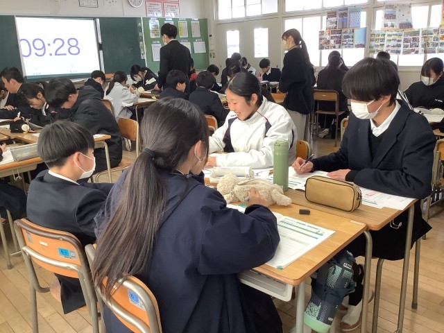 2月12日は、テスト最終日でした。テスト週間が長くなりましたが、生徒たちは本当にがんばりました。また、6限目に行われた進路学習では、自分の強みは何なのかを話し合いました。楽しそうにグループで活動する様子が見られました。3学期も残りわずかですが、今のクラスでの時間を大切にしていきたいですね。
