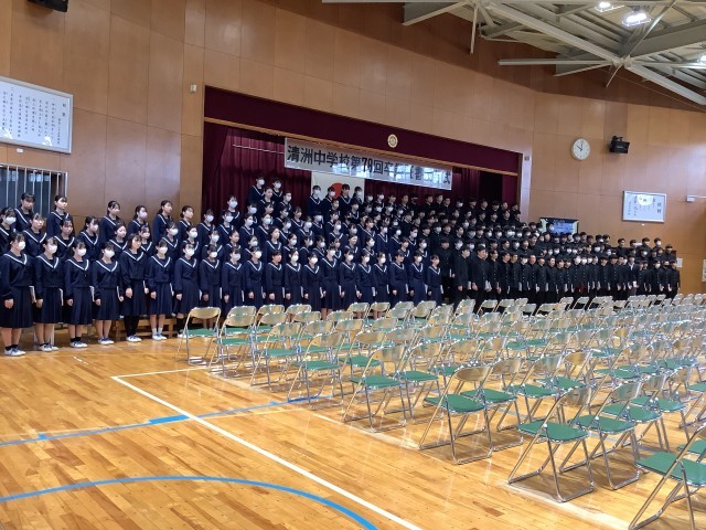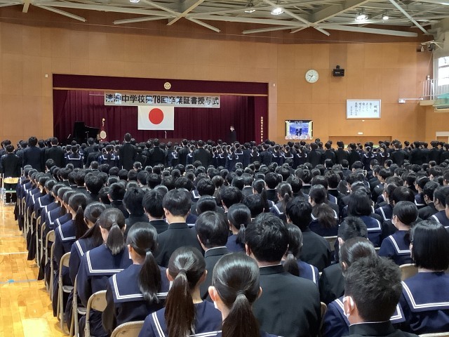 全校生徒が集まり、卒業式本番を想定したお辞儀の仕方や返事、動きの確認などを行いました。3年生の生徒全員が一丸となり堂々とした返事や態度が見られ、大変立派でした。また1・2年生の生徒も在校生としての自覚を持ち、きちんとした態度で参加できていました。集団で生活する時には、お互いのことを思いやり協力することが大切ですね。これからも大切なことを一歩ずつ、確実に積み重ねて行動しましょう。