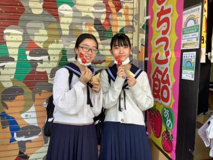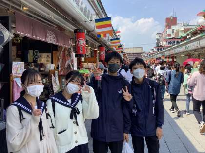 散策班で仲見世通りを散策しています。買ったものを立ち止まって食べている生徒もいます。