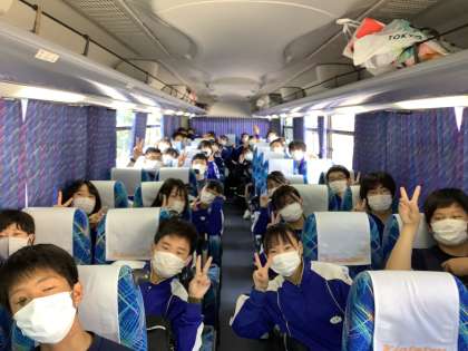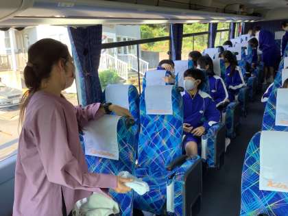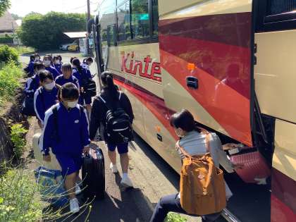 生徒は泊まったペンションから、バスで東海大学海洋博物館を目指しています。