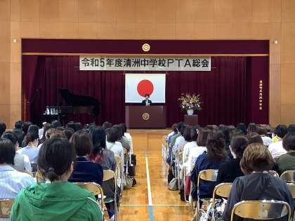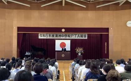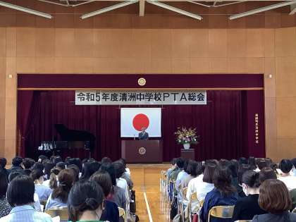 最後に校長挨拶並びに職員紹介がありました。挨拶の中で、今年度のスローガン「進取挑戦 〜進取の旗を振りかざそう〜 ワクワクドキドキ大作戦」のもと、考えを深めるために清洲会議をおこなっていることを伝えました。生徒の充実した中学校生活となるよう生徒会活動や委員会活動を活性化していきますので、各ご家庭でのご支援をよろしくお願いします。