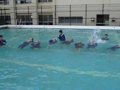 3年生にとっては、本年度初めてのプールです。気持ちよさそうに入水して、水の中を走ったり、泳いだりしました。服を着ているとどれだけ動きづらいかを感じることができたと思います。