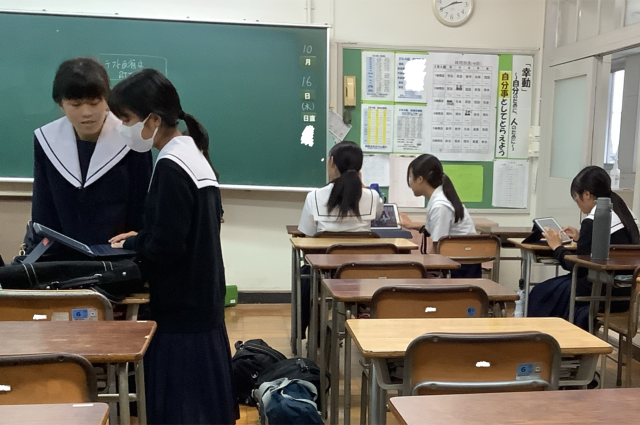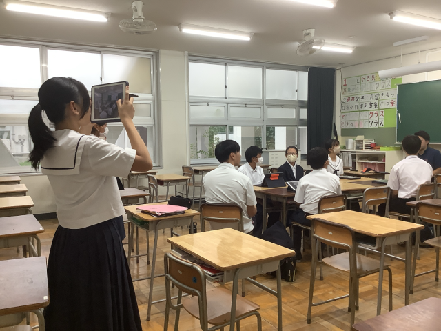 この委員会の仕事は、活動している委員会を取材し、自分たちで活動の様子の記事を作るという内容です。まずは、活動時間になったら各委員会の活動をカメラに収めに行きます。次に内容をインタビューして、記事にするという流れです。完成した記事を、お互いにチェックをして誤字脱字のないように心がけています。写真には、名札の名前を見えないように編集することにも気を配っています。
