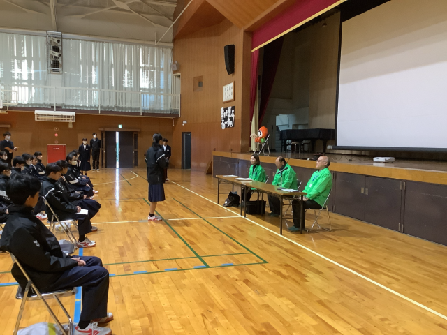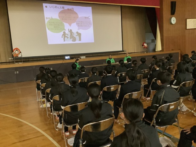 12月12日(金)の6時間目に人権集会を行いました。人権擁護委員の方々をお招きし、講話をしていただきました。人権とは何か、いじめとは何かやSNSでの人間関係トラブルの実例を聞き、いじめの構図などを学びました。生徒たちは、日頃の学校生活でも友達に優しく接していくことの大切さを改めて感じていました。
