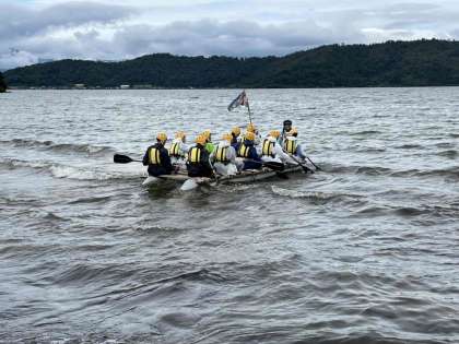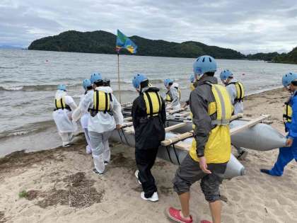 各クラスの筏が完成して、いよいよ進水です。黄→A組、白→B組、青→C組、赤→D組です。