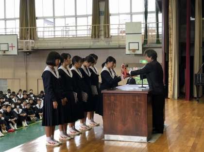 朝の会 公開日 2019/11/12 更新日 2019/11/12 3年 11月11日(月)の朝の会にて、男子剣道部、女子剣道部、男子卓球部の表彰伝達が行われました。どの部活動も2年生が中心となり、新チームで一生懸命頑張っています。 いいね(0)
