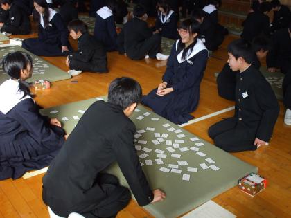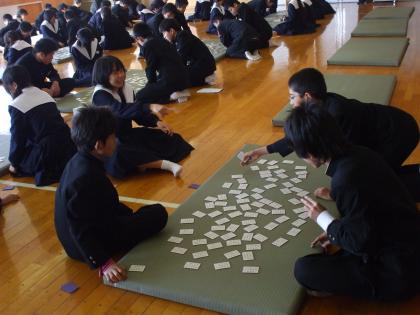 2年生 百人一首大会!! 公開日 2009/01/28 更新日 2009/02/16 2年 1月23日、2年生では百人一首大会が開催されました。 より多くの札を取ろうと皆真剣で、誰かが札を取るたびに歓声があがっていました。とても盛り上がり、皆が楽しむことのできた百人一首大会となりました。 これからも百人一首にふれることで、そのおもしろさを知り、古文に親しみをもってほしいと思います。 いいね(0)