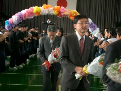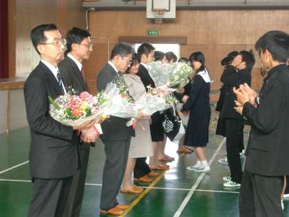 どの先生も、新川中学校に対する熱い思いを語られ、全校生徒一人一人が、その言葉をしっかりと受け取っていました。最後に生徒代表が感謝のメッセージカードと花束を贈り、体育館に校歌が響き渡る中、体育館を退場されました。