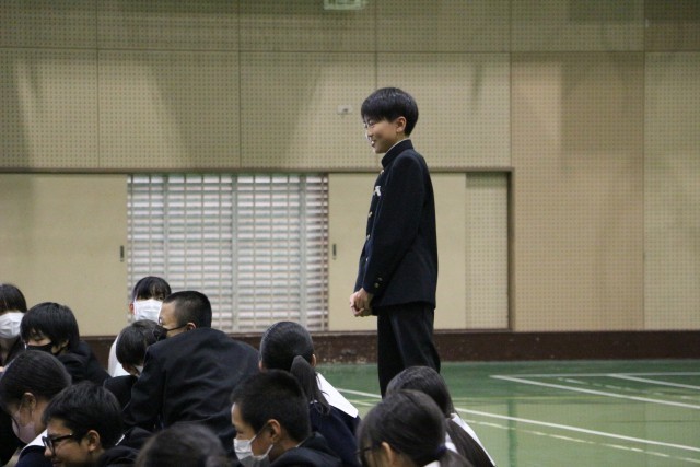 12月22日(月)に、今年最後の学年集会が行われました。2学期は、体育大会や文化活動発表会があり、3年生らしく一生懸命頑張る姿を下級生に見せることができました。