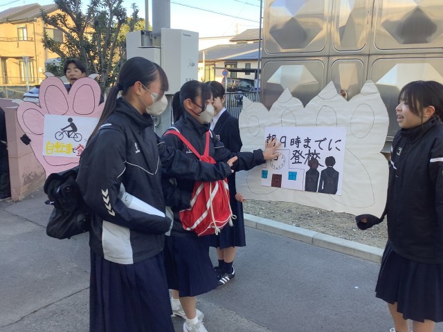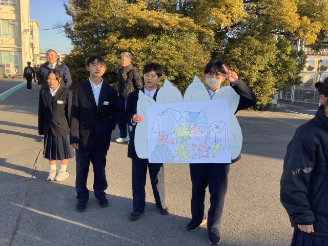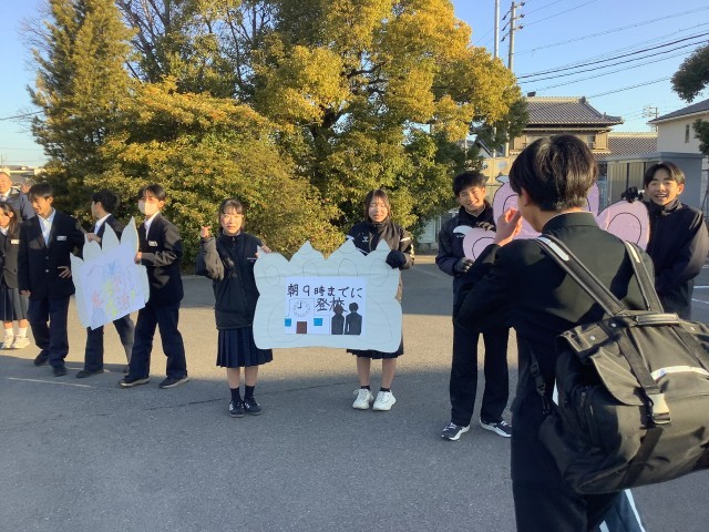 みなさんこんにちは!生徒会執行部です。先日12月9日、10日はあいさつ運動がありました。生徒の皆さんは寒い中、元気よく挨拶を交わしていました。ちゃんと体を動かし、風邪をひかないように気を付けましょう!