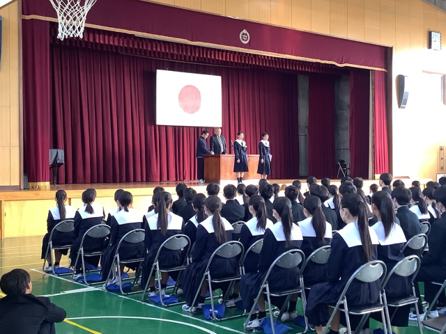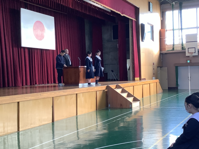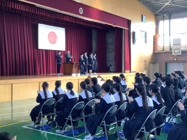 表彰伝達では卓球大会や読書感想画コンクールなどの表彰が読まれました。表彰を取った新中生の仲間に称賛の気持ちで大きな拍手がなり響いており、仲間を讃えている気持ちがとても伝わってきました。