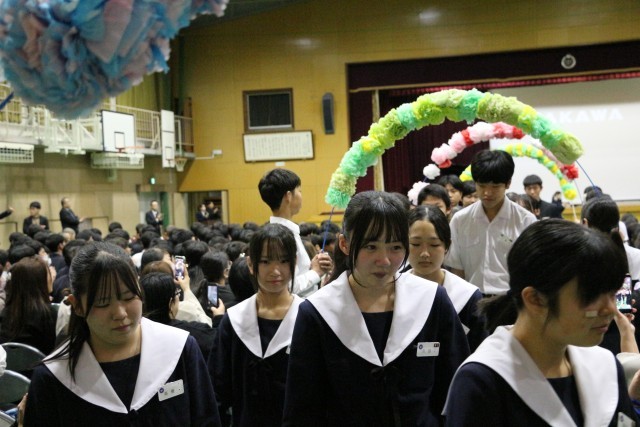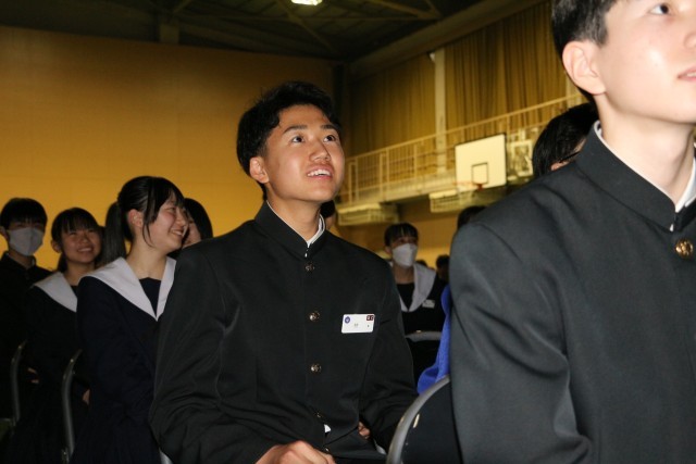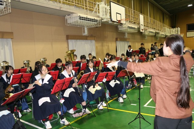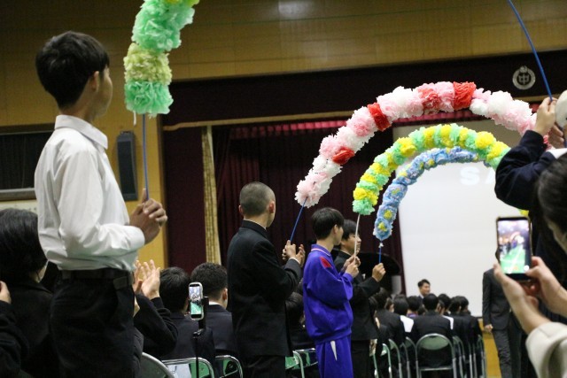 1・2年生の有志による心のこもったメッセージ動画、懐かしい写真が映し出された思い出のアルバム。そして、この日のために練習を重ねてきた「想い出がいっぱい」の合唱。体育館いっぱいに広がった歌声には、これまでの感謝と憧れの気持ちが込められていました。3年生の心に、きっとまっすぐ届いたことと思います。入退場では、ブラスバンド部が心を込めて演奏し、会場をあたたかな雰囲気で包みました。音楽と拍手に迎えられ、送られた3年生の表情は、どこか誇らしく、そして少し照れくさそうでもありました。