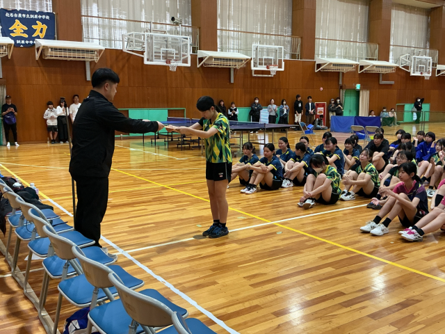 団体戦は、予選リーグで西春中、天神中、訓原中と試合を行い、決勝トーナメントへリーグ2位通過となりました。その後、準決勝では清洲中に3-2で勝利、決勝で天神中に2-3で惜しくも敗れ、準優勝という結果でした。新人大会での悔しい思いを胸に、賞状を勝ち得ることができ、とても嬉しく思います。