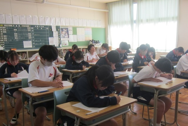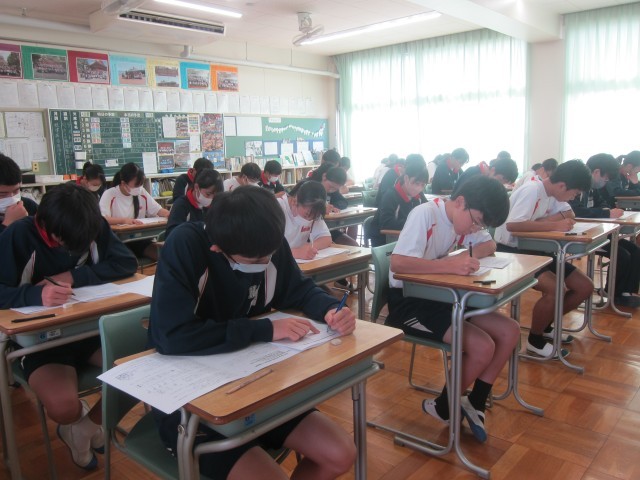 本日は、2学期中間テスト2日目です。教科は、理科と英語の2教科でした。様々なプレッシャーがあったと思いますが、2日間お疲れ様でした。このテストに向けて、休み時間も黙々と問題に取り組む姿や友達と教え合う姿がいつも以上に多く見られました。自分の頑張りを振り返り、次につなげていって欲しいと思います。