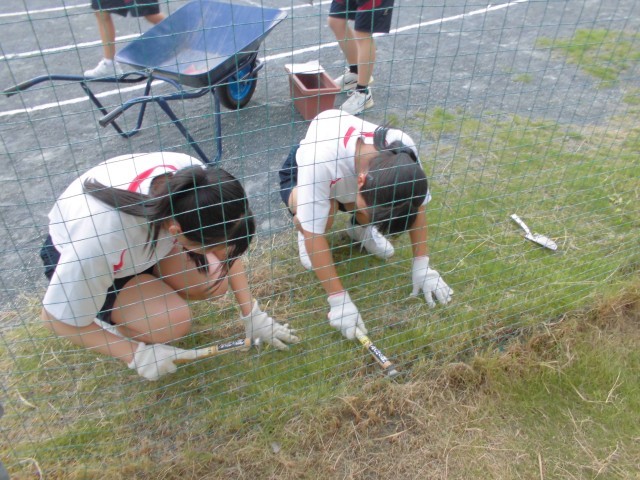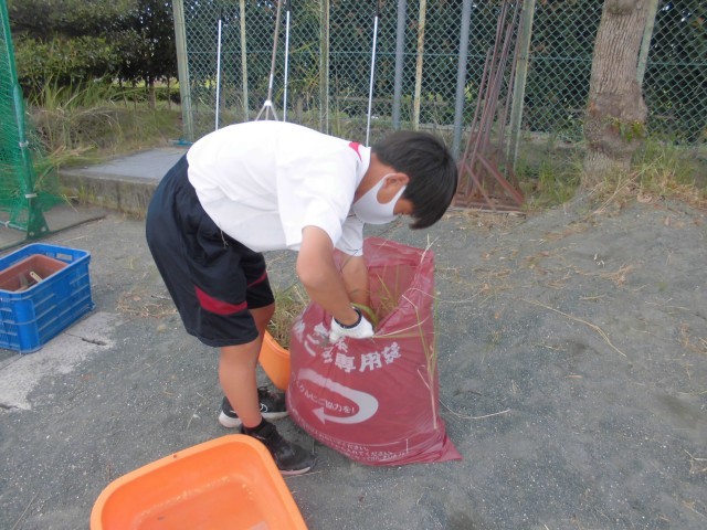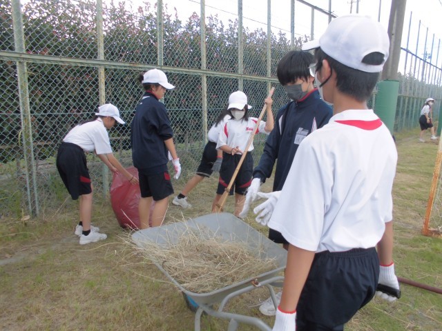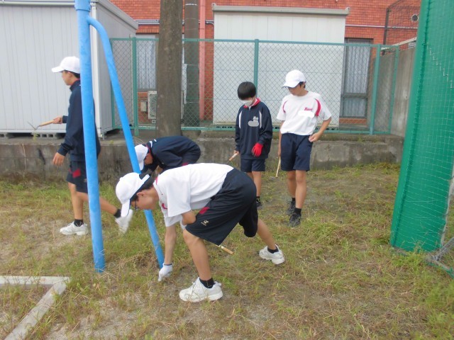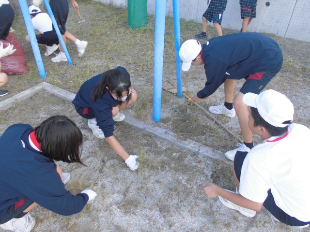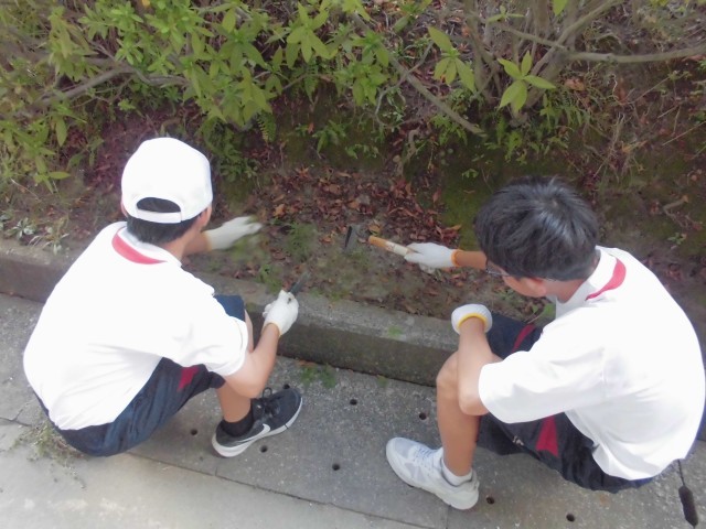 本日LTの時間にて、全校除草作業を行いました。風が強い中ではありましたが、抜いた草が飛ばないように工夫したり、除草道具を分担したりと、協力して掃除することができました。